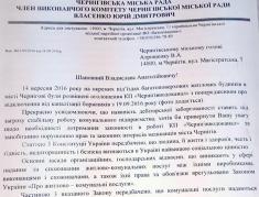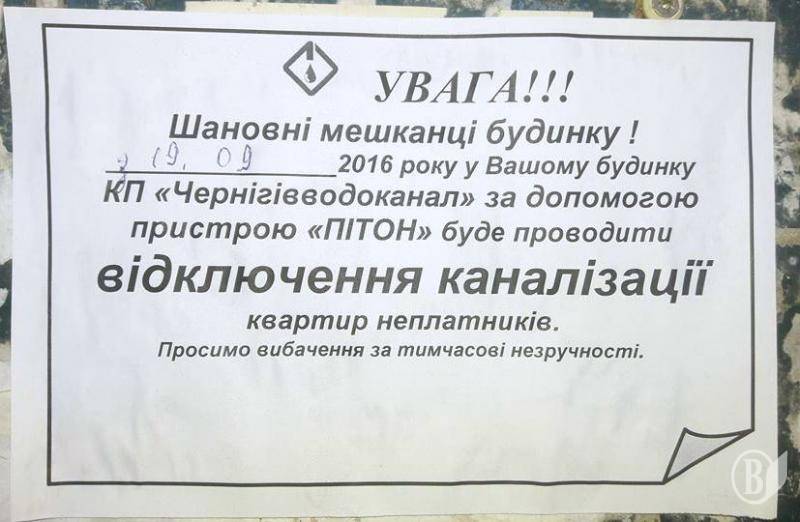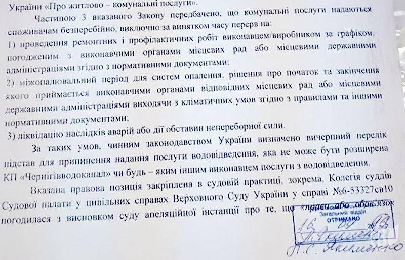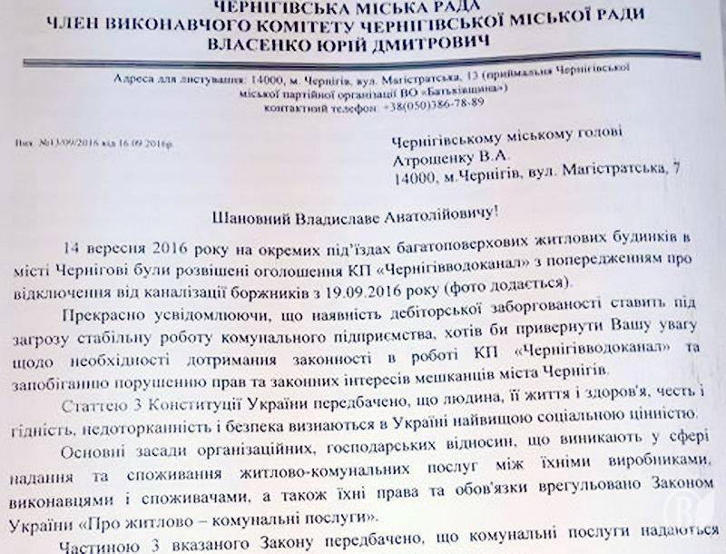 Перед нами – лист Юрія Власенка, котрий пише про незаконність відключення води жителям багатоповерхівок через бажання КП «Чернігівводоканал» перекрити комусь із боржників злив у клозеті.