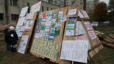 Хтось із присутніх запропонував підпалити повалений паркан та його ідею відкинули, натомість, люди почали виносити щити з галявини і складати їх докупи. На одному із них розвісили страйк-плакати і дитячі малюнки.