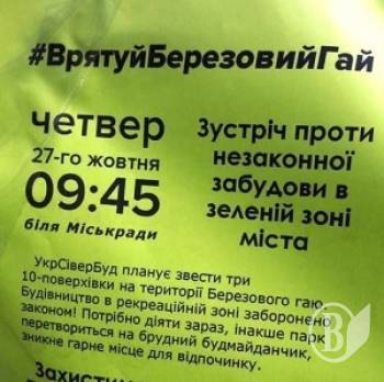 «УкрСіверБуд планує звести три 10-поверхівки на території Березового гаю. Будівництво в рекреаційній зоні заборонено законом! Потрібно діяти зараз, інакше парк перетвориться на брудний будмайданчик, зникне гарне місце для відпочинку»,- йдеться в оголошенні.