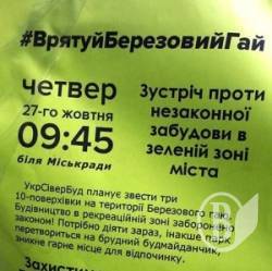 «УкрСіверБуд планує звести три 10-поверхівки на території Березового гаю. Будівництво в рекреаційній зоні заборонено законом! Потрібно діяти зараз, інакше парк перетвориться на брудний будмайданчик, зникне гарне місце для відпочинку»,- йдеться в оголошенні.