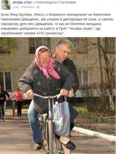 «Мать народного депутата Валерия Давыденко (кукловод «Наш Край Чернігівщина») владеет 12 компаниями, вложив в них десятки миллионов гривен, ездит на «Ленд Крузере», «Лексусе» и Инфинити, имеет $560 тыс. налички и может позволить себе одолжить 0,9 млн гривен своей же компании», – помітив Ігор Стах
