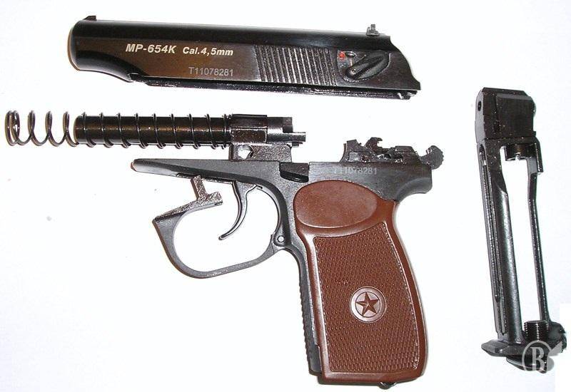 Добре хоч, повідомляють не про «пістолет», а про «предмет, схожий на пістолет». Хоча в тому предметі, схожому на пістолет, чітко впізнається пістолет суто розважальний. Та й маркування на затворі відповідне, з назвою предмета: «МР 654К» та позначкою «cal. 4,5 mm». Це іграшка.