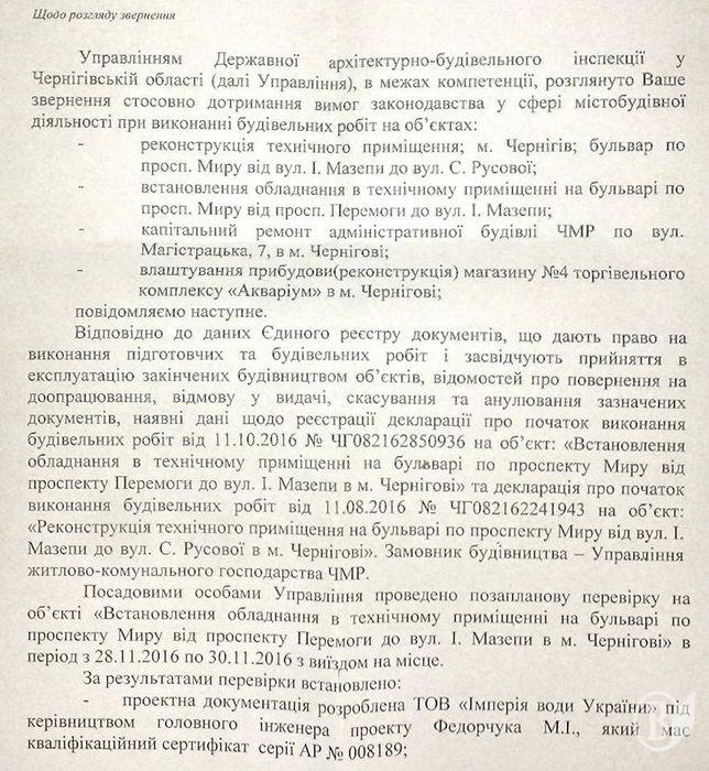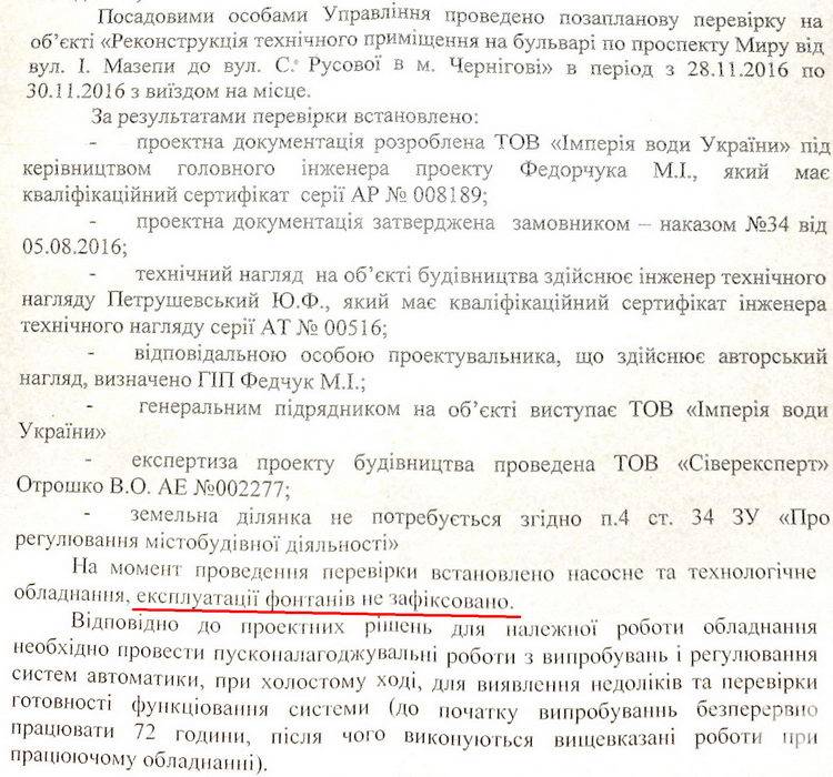 Інспектори управління Державної архітектурно-будівельної інспекції у Чернігівській області не виявили факту експлуатації нових фонтанів у Чернігові восени 2016 року.