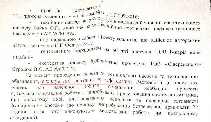 Позапланова перевірка облуправління ДАБІ встановила, що будівельні роботи з облаштування пішохідного фонтану навпроти ТЦ "Полісся" почались 11 жовтня 2016 року (так, юридично роботи почалися після фактичного пуску) і станом на 28-30 листопада 2016 року інспектори ДАБІ експлуатації фонтанів не зафіксували.