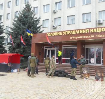 Активісти з символікою «Правого сектору» встановили намет перед приміщенням головного управління Національної поліції України в Чернігівській області на проспекті Перемоги в Чернігові.
