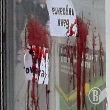 До чернігівського офісу «Сбербанку» завітали активісти громадського руху «третя позиція». Атрибути протесту – кров та наклейки «Банк окупанта».
