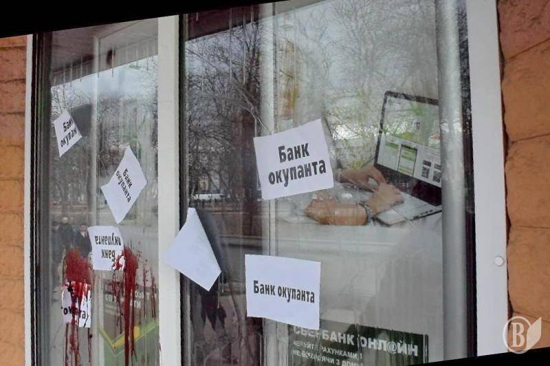 До чернігівського офісу «Сбербанку» завітали активісти громадського руху «третя позиція». Атрибути протесту – кров та наклейки «Банк окупанта».