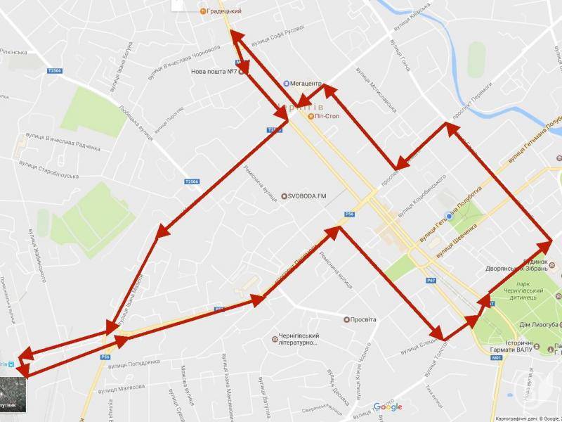 2-й маршрут з однієї околиці (район ЗАЗу) доїжджав до центру, робив там коло вулицями Шевченка, Полуботка і П'ятницькою, і повертався назад на ЗАЗ.