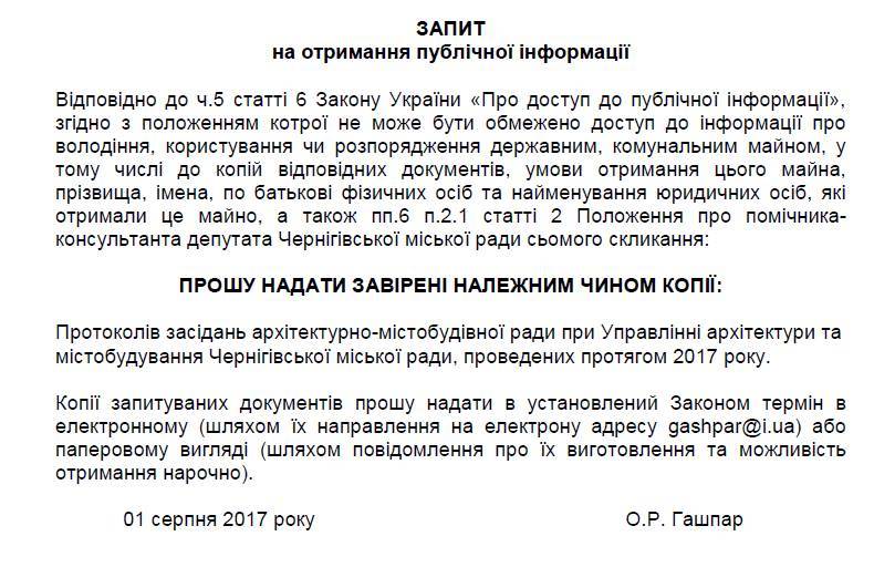Як зазначає представник ІМІ, Олександр Гашпар запитував суспільно-важливу інформацію – протоколи засідань архітектурно-містобудівної ради. На цій раді розглядаються усі проекти містобудівної документації та окремі проекти будівництва і реконструкцій об’єктів архітектури на території м. Чернігова.