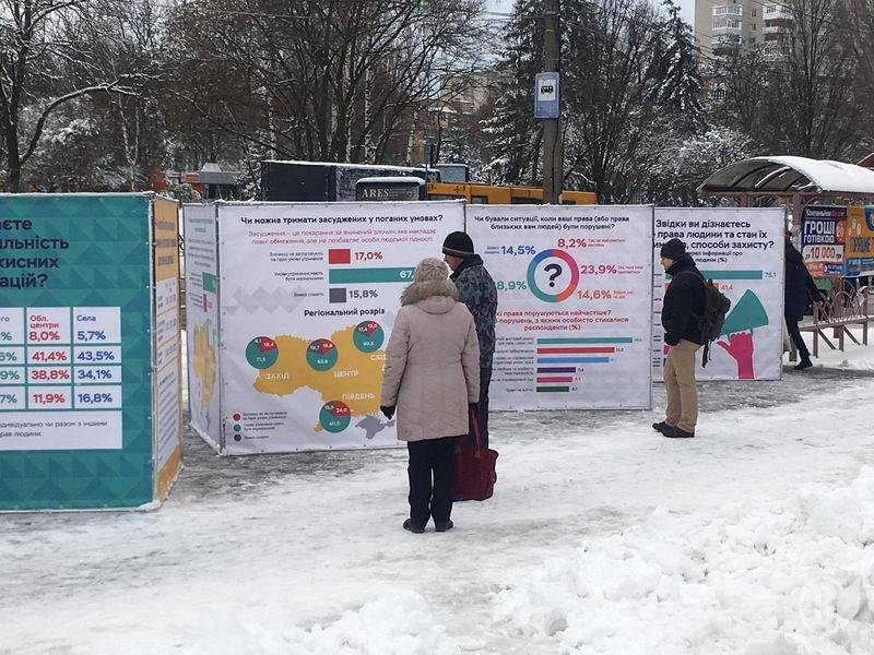 На площі перед ТЦ «Мегацентр» у понеділок 11 грудня було встановлено тематичну експозицію: шість кольорових конструкцій-кубів, проілюстрованих найважливішими даними з дослідження – графіками, цитатами, висновками та рекомендаціями. Регіональні особливості у відповідях респондентів представлені стосовно п’яти регіонів України – Заходу, Сходу, Півдня, Донбасу та Центру (зокрема, Чернігівської області). Також на площі організатори роздавали зацікавленим громадянам інформацію про опитування та діяльність правозахисних організацій, до яких можна звертатися за безкоштовною допомогою.