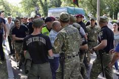 «Раптом у колоні з'явився червоно-чорний прапор боротьби і пролунало «Слава Україні». тріснули палки і впали криваві знамена, – повідомляє організація «С14». – Була перша спроба затримати націоналістів, але праві своїх відбили і залишились з трофеями».
