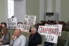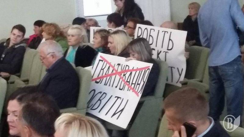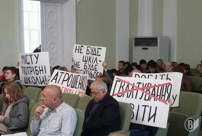 Депутатів та міського голову Владислава Атрошенка на 34 сесії міськради зустріли з плакатами «Освіта для всіх», «Досить гвалтувати освіту», «Місту потрібні школи».