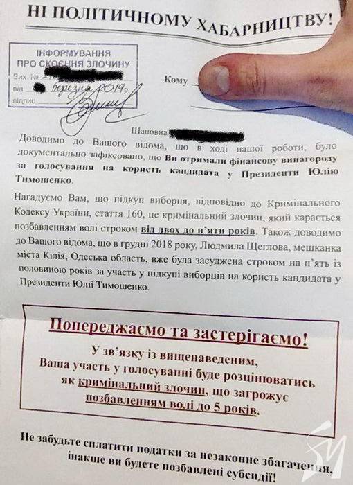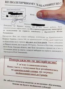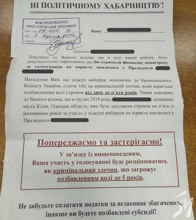 «Сьогодні в поштові скриньки чернігівців розкидали листівки, текст яких психологічно тисне на пенсіонерів. Мовляв, вони продали свій голос, тож їхня участь у виборах – злочин, – повідомляють в поліції. – У листівках зі штампом та підписом невідомої особи людям погрожують кримінальним переслідуванням. Це при тому, що підтвердження продажу голосу саме цими заявниками немає. Більше того, з них вимагають сплатити податки за незаконне збагачення, інакше погрожують позбавити субсидії».