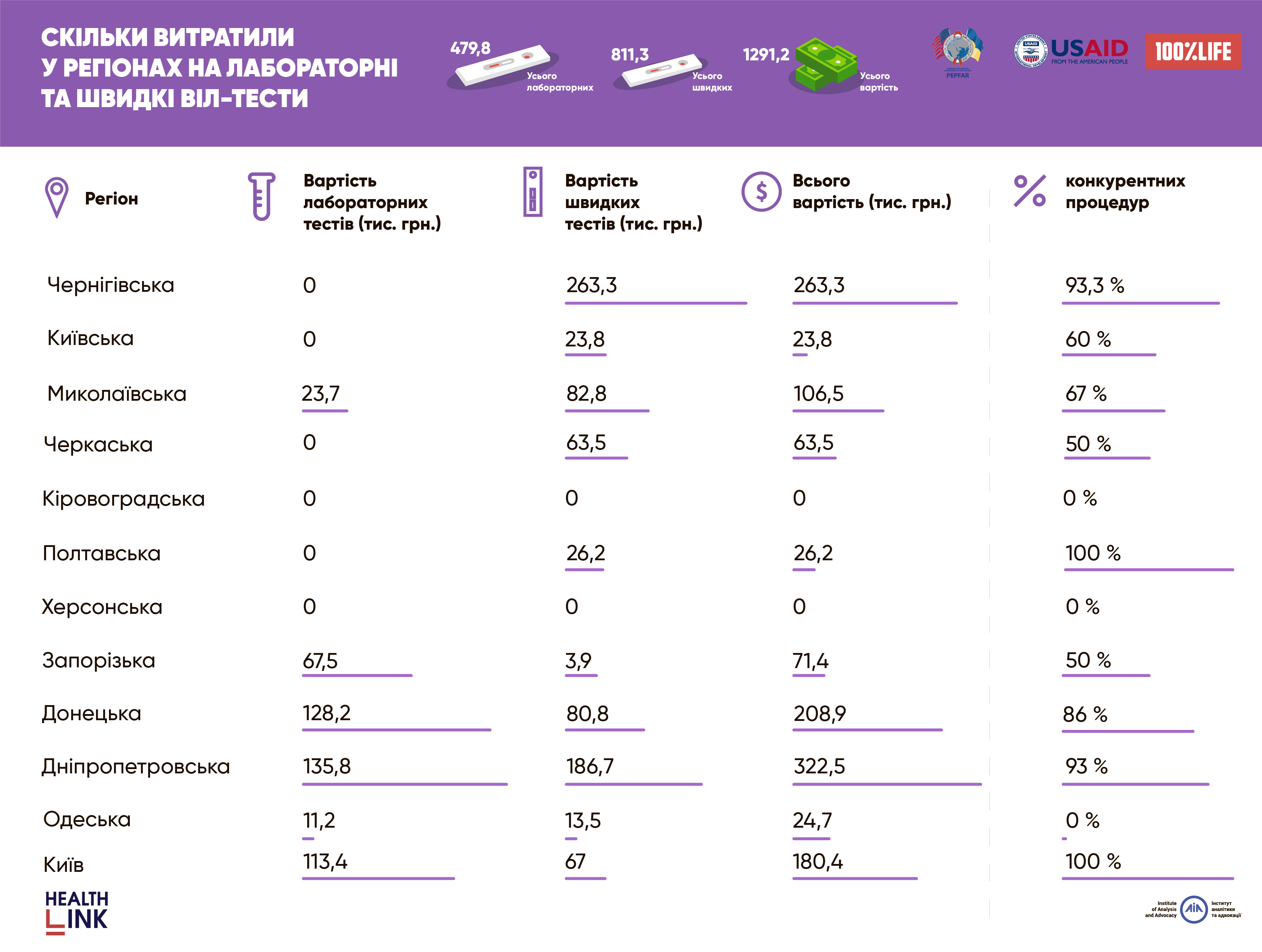 В інфографіці показано співвідношення витрат на лабораторні та швидкі тести на ВІЛ, а також відсоток конкурентних процедур в розрізі регіонів.