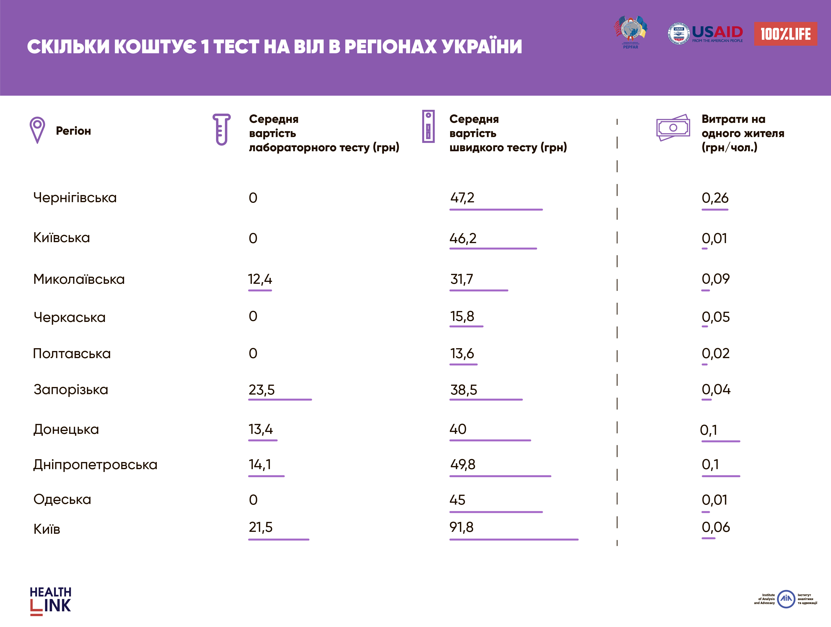 У середньому лабораторний тест коштує від 12,4 грн у Миколаївській області до 23,5 грн в Запорізькій. Швидкі тести в середньому купують від 13,6 грн за одиницю в Полтавській області до 91,8 грн в місті Київ. Така різниця в ціні може бути обумовлена різними видами, а також виробниками тест-систем на виявлення ВІЛ.