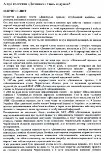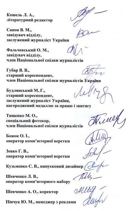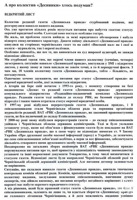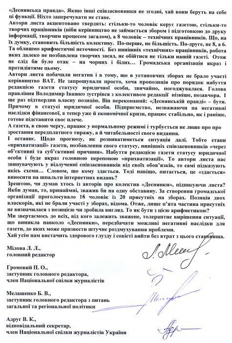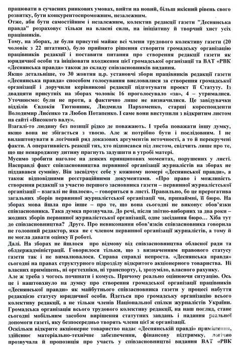 Ми стурбовані також тим, що окремі члени нашого колективу (точніше, четверо) загострюють ситуацію навколо «Деснянської правди», виступили у ЗМІ з відкритим листом, у якому знову ж таки виклали не зовсім точні, а то й перекручені факти. З чим ми, 18 членів колективу газети «Деснянська правда», тобто – більшість, не погоджуємося.