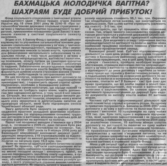 В бахмацкой районной газете (Черниговская обл.) депутат областного совета Таисия Алексеевна Марченко в своей статье безосновательно облила грязью предпринимателей, центр занятости, бахмацких врачей, фонд по временной потере работоспособности, проявила недоверие правоохранительным органам.