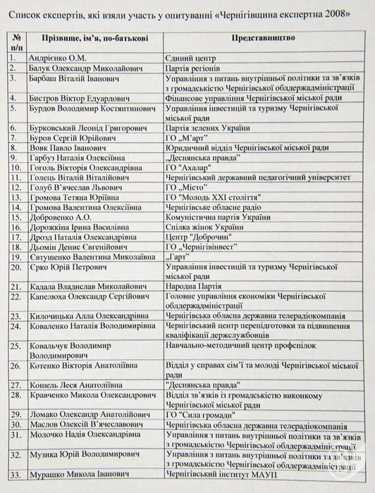 Дослідження проведено у м. Чернігів у грудні 2008 року – січні 2009 року методом експертного опитування. Загальна кількість опитаних – 69 чоловік.