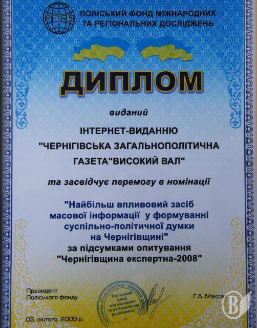 Интернет-издание «Высокий Вал» и газета «Семь дней» стали самыми влиятельными черниговскими СМИ в своей номинации согласно опроса известных экспертов города, проведённого Полесским фондом международных и региональных исследований.