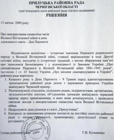 15 квітня Прилуцька районна рада Чернігівської області ухвалила рішення про використання червоних прапорів під час святкування Дня перемоги.