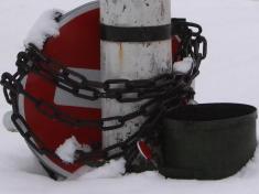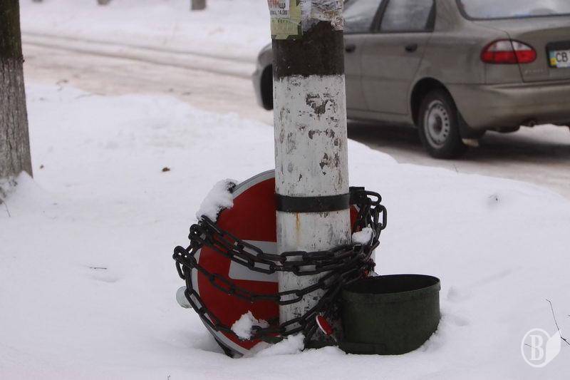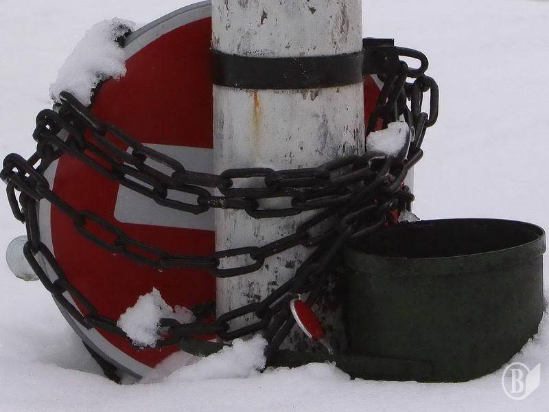 А вот штрафы берут исправно. Караулят под каждым знаком, знают где «хлебные места». Так вот, вернемся к «кирпичу». Раз знак пропадает, а он же на балансе, нужно его привязать. И не просто привязали, а еще и цепью заковывали, прямо около Носовской райгосадминистрации.