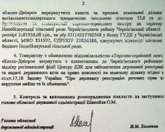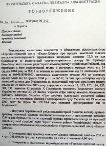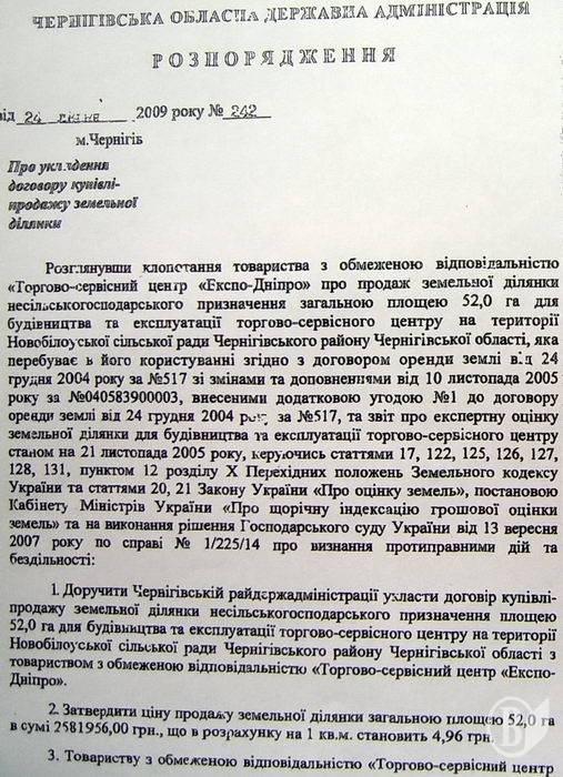 24 липня 2009 року було видано розпорядження Чернігівської обласної державної адміністрації за №242 «Про укладення договору купівлі-продажу земельної ділянки», підписане головою обласної державної адміністрації Хоменком В.М. У кінці липня 2009 року, виконуючи досягнуті домовленості, Паньков А.С. запропонував внести кошти в сумі 300 тис. доларів готівкою. Але ця пропозиція Хоменком В.М. не була прийнята і було запропоновано з проплатою зачекати. Беручи до уваги, що на 18 вересня минулого року всі дії посадових осібчернігівської райдержадміністрації свідчили про те, що вони не мають наміру укласти договір купівлі-продажу земельної ділянки, товариство вимушене було через Панькова А.С. внести в касу зазначеного фонду готівкою кошти в сумі 1 100 000 (один мільйон сто тисяч) грн., про що було повідомлено особисто Хоменка В.М. Оскільки після сплати коштів договір купівлі-продажу земельної ділянки не був укладений, у мене виникли певні сумніви щодо намірів продати земельну ділянку. Через певний час мені стало відомо, що зазначене розпорядження Чернігівської обласної державної адміністрації є фіктивним, бо під №242 в обласній адміністрації зареєстровано інше розпорядження. Після цього всі мої намагання зустрітися з Хоменком В.М. виявилися марними, а директор Фонду Коваленко О.Б. заявив, що він виконував вказівки обласної державної адміністрації і нічого конкретного пояснити не може.