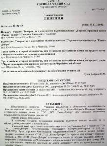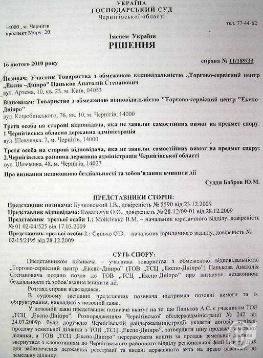 17 листопада 2008 року ухвалою Київського апеляційного адміністративного суду постанова Господарського суду Чернігівської області у справі №1/225/14 залишена без змін та набула законної сили. Оскільки виконання зазначеного судового рішення посадовими особами Чернігівської РДА ігнорується, засновник та генеральний директор товариства Паньков А.С. вимушений був звернутися до голови Чернігівської обласної державної адміністрації Хоменка В.М. У липні 2009 року на особистому прийомі у нього останній заявив Панькову А.С., що без його особистого рішення питання не буде вирішене. Для його позитивного вирішення Хоменко В.М. запропонував товариству сплатити 300 тис. доларів США на рахунок благодійного фонду «Чернігівщина» в якості благодійної допомоги.