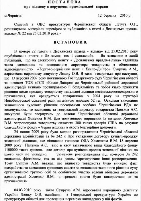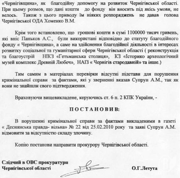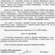 Следователь в ОВД прокуратуры Черниговской области Летута О.Г., рассмотрев материалы проверки после публикации в газете «Деснянская правда. Свободная» №22 от 25.02.2010 года, постановил: