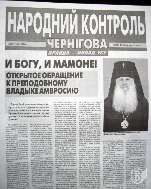 Пусть каждый, кто читает эти строки и возможно не соглашается с ними, простит нас, и Вы, отче Амвросий, простите нас, если что не так. Но просим вас мы лишь об одном: станьте по настоящему духовным лидером Чернигова и не идите на поводу у политиков и их даров, какими бы заманчивыми они ни были. Эти машины, участки, дома, деньги и прочие материальные прелести нашего мира – не что иное, как испытания и приводят лишь к томлению духа и утрате духовности. Не позволяйте никому втягивать церковь в политику и тем самым использовать верующих людей в угоду политиканам.