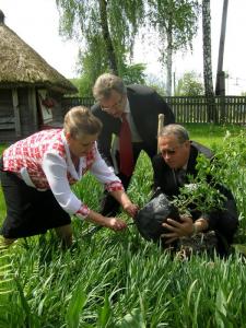 На фото: Представители партии „Сильная Украина” Владислав Мозговой и Владимир Дрозденко вместе с директором музея Любовью Наконечной садят розы.