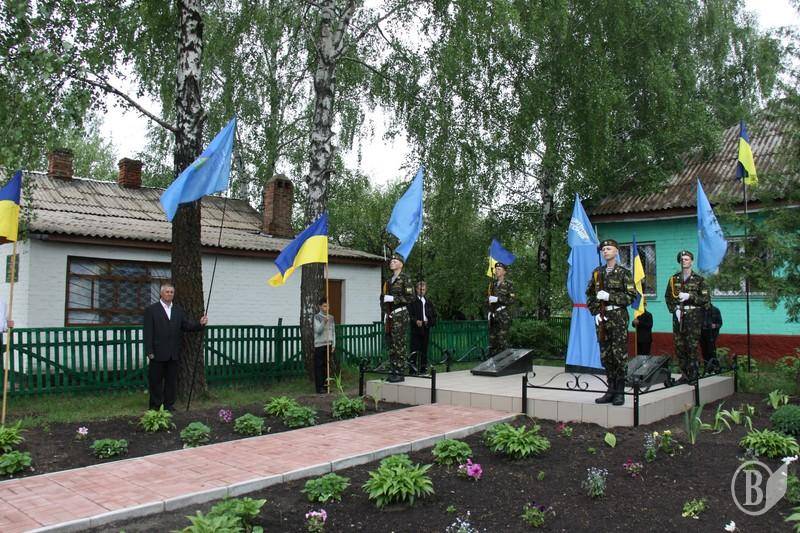 Заручившись мовчазною підтримкою селян, підійшов до монумента і поклавши квіти, він зробив те, що зробив би кожен ветеран, у часи своєї молодості, але всіх їх підводили під руку, бо роки вже не ті -- забрав один з прапорів «Партії Регіонів» і відкинув його подалі від пам’ятника.