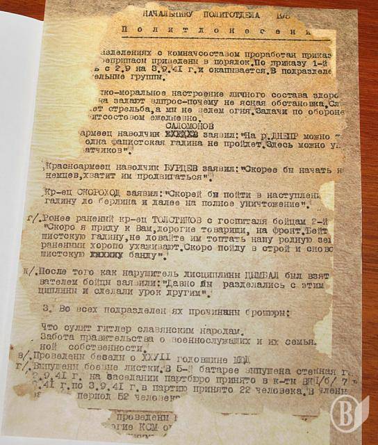 Директор історичного музею Сергій Лаєвський розповів гостям про хід робіт з консервування та часткової реставрації знайдених документів. Унікальність документів полягає в тому, що більшість з них існують лише в єдиному екземплярі. На документах є помітки олівцем, які містять інформацію про долі тисяч бійців Радянської армії, що загинули захищаючи наше місто.