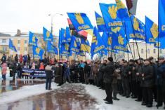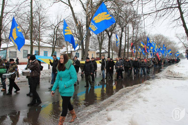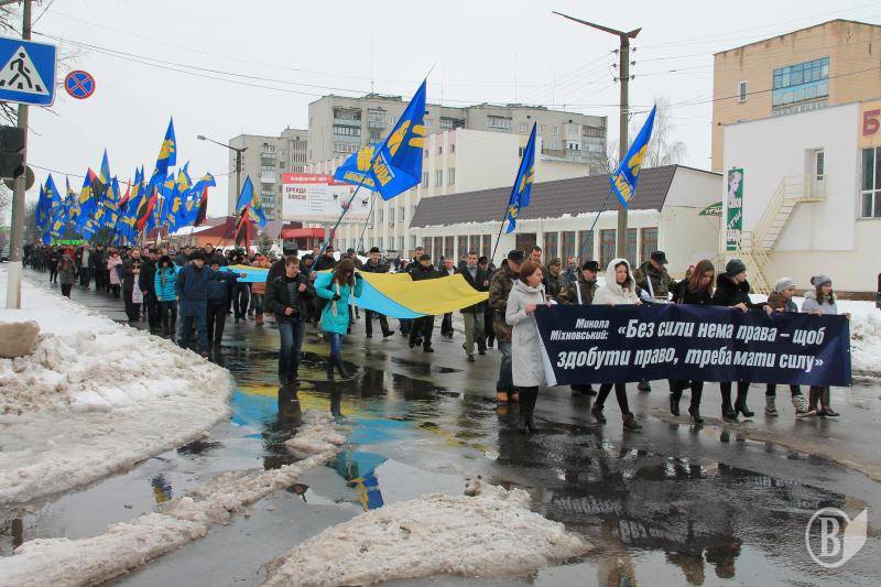 Активісти несли плакати, на яких було написано заповіді з Декалогу українськго націоналіста, автором якого є Микола Міхновський. Очолили колону народні депутати-свободівці.