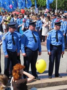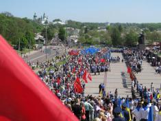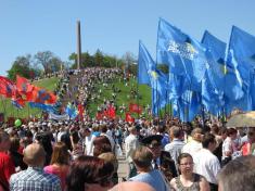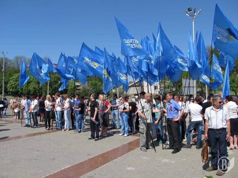 І ще одне – на мітинг вийшла згуртована група прапороносців з десятками синіх полотнищ Партії регіонів. Що, не можна було прийти без демонстрації своїх партійних уподобань?! Ще можна зрозуміти присутність на заходах стягів лівих і лівацьких партій. Вони, особливо комуністи, вважають себе ідейними наступниками КПРС – керівної партії СРСР. А яким боком до Дня Перемоги належить партія, створена у 90-х роках, хтозна…