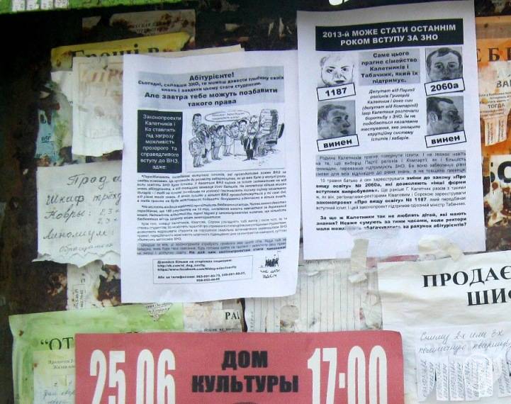 В Чернігові молоді люди активісти громадянського руху «Відсіч» в рамках кампанії на захист зовнішнього незалежного оцінювання поширюють серед абітурієнтів та їх батьків листівки проти законопроекту депутатів від Партії регіонів та Компартії - Григорія та Ігоря Калетників про повернення іспитів при вступі до вищих навчальних закладів та законопроекту «Про вищу освіту».