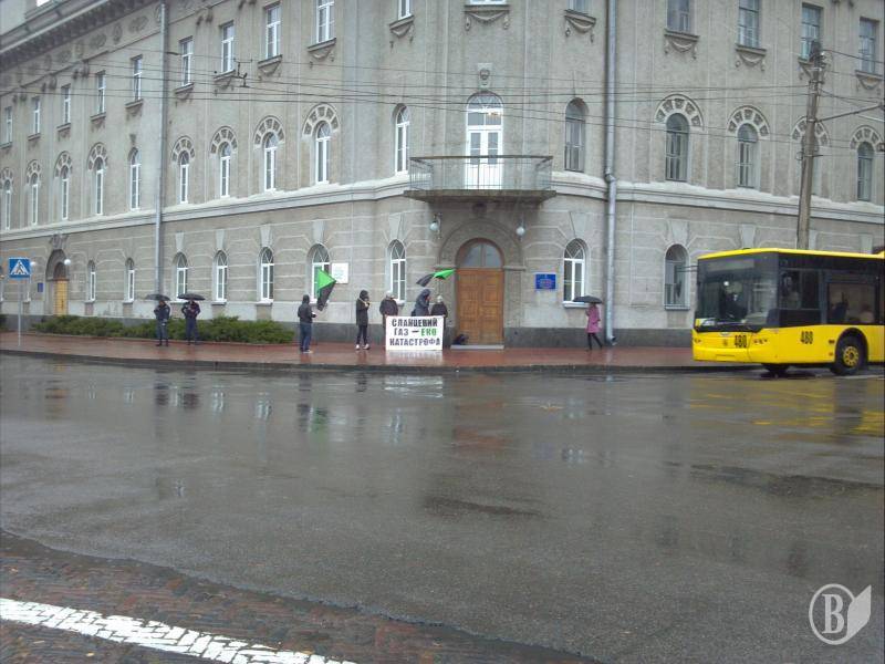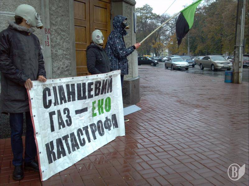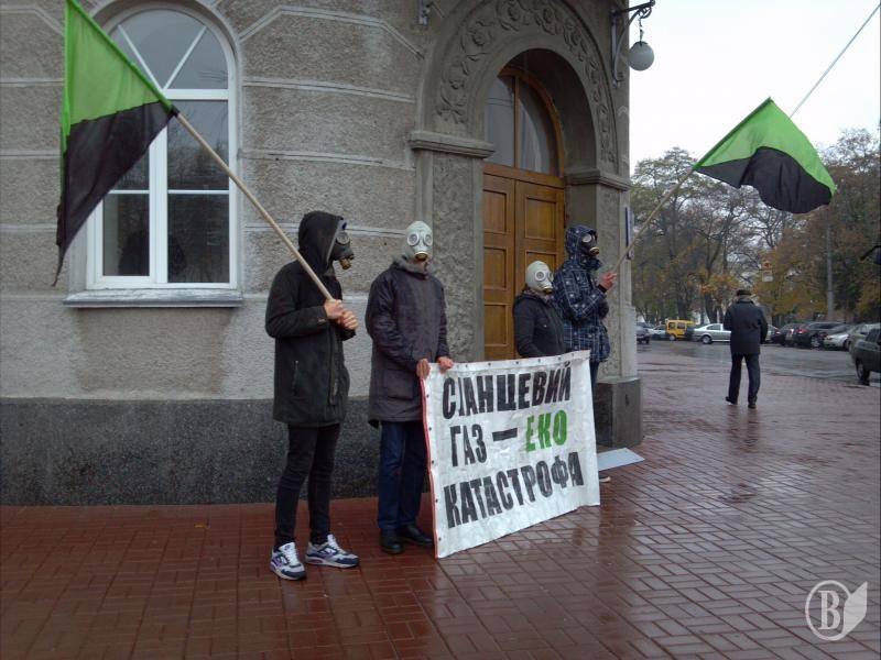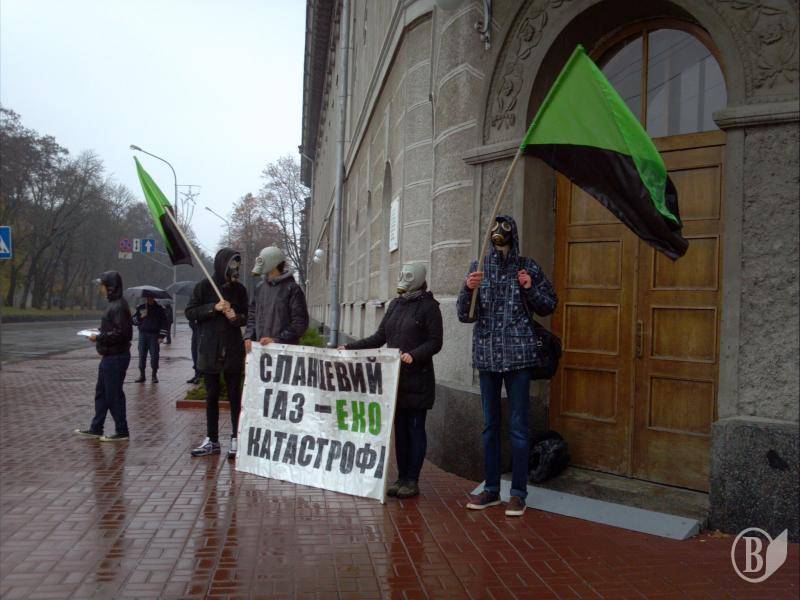 Ребята в противогазах с черно-зелеными флагами пикетировали черниговскую облгосадминистрацию с плакатом против добычи сланцевого газа.