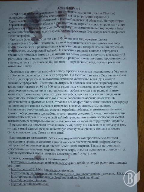 В листовках, которые распространяли активисты, записано, что в результате разрыва в породе образуются трещины, с помощью которых сланцевый газ потом должен поступить в скважину.