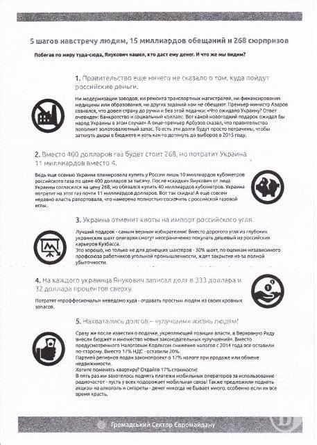 - Дух Євромайдану живий, по всій Україні люди самоорганізовуються, аби довести розпочату справу до кінця. Наша мета – розповісти людям про наслідки поїздки Януковича до Росії, на цю тему ми підготували листівки. Так виходить, що кожного українця продали за 333 долари, - каже львів’янка Василина.
