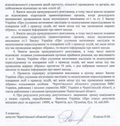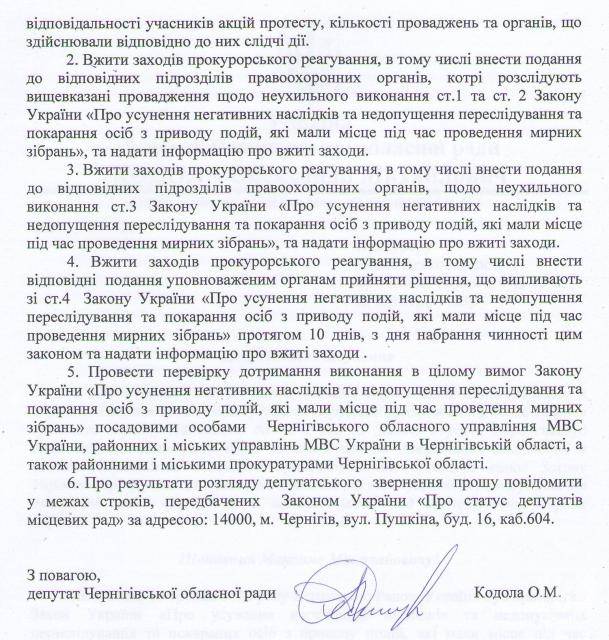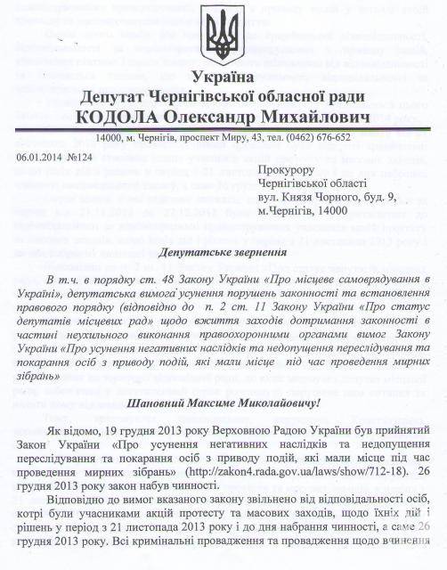 Як наслідок, депутат обласної ради Олександр Кодола, враховуючи умови закону та резонансну ситуацію, яка склалася в Чернігові та Чернігівській області звернувся з проханням: