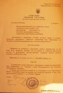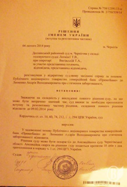 Суддя Деснянського районного суду Чернігова Логвіна постановила відмовити у задоволені позову Приватбанку до Андрія Леоненка про стягнення заборгованості 18,5 тис. грн.