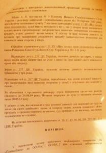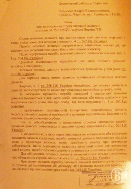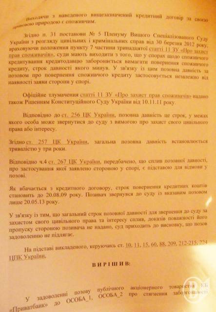 - Я запитав, коли я порушив забов’язання. Представник Приватбанку відповів, що у жовтні 2008 року. Згідно ч. 5 ст. 261 ЦК України строк позивної давності починаєтся від дня, коли я не сплатив черговий платіж за кредитом. Я наголошував, ще що дія картки закінчилася у травні 2010 року, отже строк позовної давності сплив. Ще я наголошував, що це споживчий кредит і згідно пункту 7 частини 13 статті 11 ЗУ “Про захист прав споживачів забороняється вимагати кредит, срок позивної давності якого (3 роки) сплив, - розповідає Андрій.
