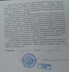 Я прочитала решение суда, где четко указано (цитата из решения): «Визнати недостовірною та такою, що принижує честь, гідність та ділову репутацію Білоножка Валерія Віталійовича наступну інформацію: у назві статті „... і косить від роботи“ та в тексті „Наголошую, що все це відбувалось у робочий час“, поширену інтернет-виданням „Уездные новости“... Зобов»язати Білоусенка Максима Валерійовича та Волосянкіна Ігора Анатолійовича протягом 30 днів з дня набрання цим рішенням законної сили спростувати поширену ними інформацію у статті..." И что здесь непонятно написано? Как это еще можно читать? Игорь, к сожалению читать «что говорят», как ты мне советуешь, я не умею, могу только слышать, и тот бред, что вы с Билоусенко наговорили изданию «Высокий вал» я слышала, ничего умного, на те же грабли. Теперь, я так понимаю, очередь Пучки и Хоменко подавать в суд.