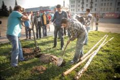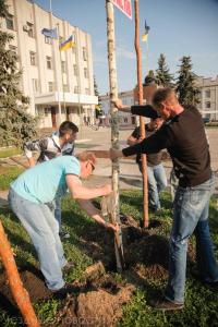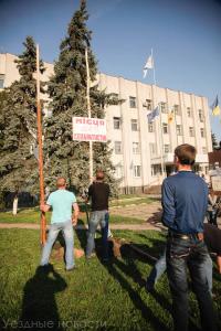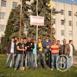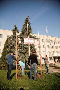 Активисты нежинской самообороны майдана, чтобы предупредить заранее любителей помутить воду в городе, вкопали три кола прямо на"лобном"месте в центре Нежина.