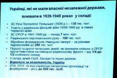 Водночас він відзначив, що особливістю України було те, що велика кількість українців брала участь у збройній боротьбі не лише на боці воюючих сторін, а й боролися за незалежність України проти нацистського та радянського поневолення в Українській повстанській армії та інших національно-визвольних формуваннях. У 1944 р. в УПА нараховувалося понад 100 тис. вояків, а всього через УПА (в роки війни і пізніше) пройшло понад 500 тис. осіб.