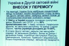 Особливо це важливо сьогодні напередодні відзначення Дня Перемоги, коли північно-східний сусід використовує міфи та фальсифікації як зброю проти України. Так, він процитував твердження Й. Сталіна щодо вирішальної ролі російського народу у перемозі над гітлерівською Німеччиною від 25 травня 1945 р. й заяву В. Путіна за 2010 р., що російський народ і без допомоги українців та інших народів СРСР виграв би війну.