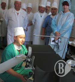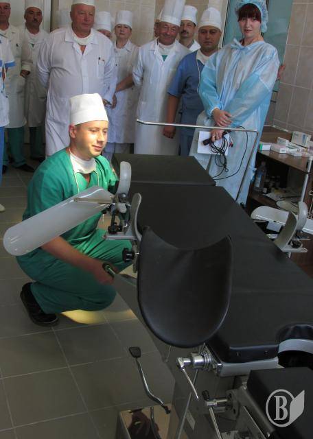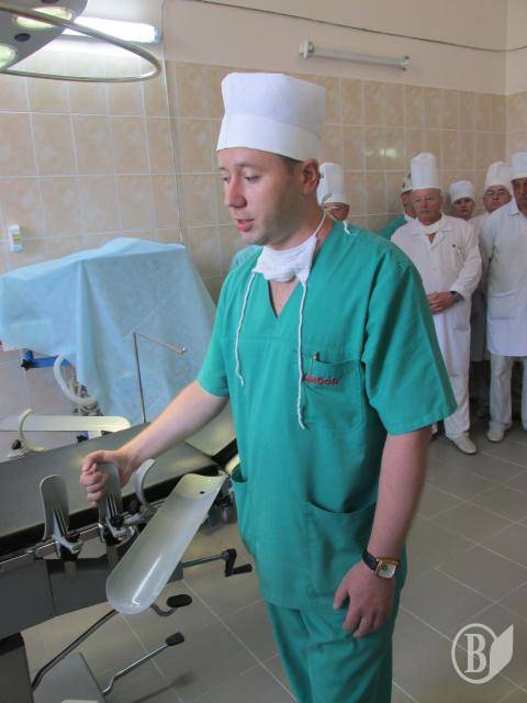 Тут же он и демонстрирует: стол вращается, наклоняется и складывается в самых разнообразных комбинациях. Анатолий Отрошко говорит: «Здесь можно все операции делать: и нейрохирургические, и травматологические. Стол этот – многофункциональный. Мы когда его подбирали, то так, чтобы и проктологические, и гинекологические».