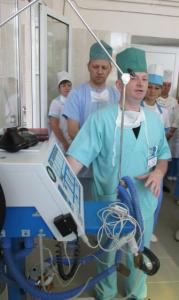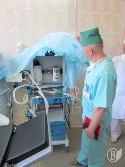 Начальник хирургического отделения госпиталя майор медицинской службы Анатолий Отрошко проводит экскурсию по операционным. Кроме блестящей чистоты привлекает внимание и новенькое оборудование: аппарат для искусственной вентиляции легких (кстати, отечественного производства), анестезиологический прибор, операционные лампы, а также новенькие операционные столы.