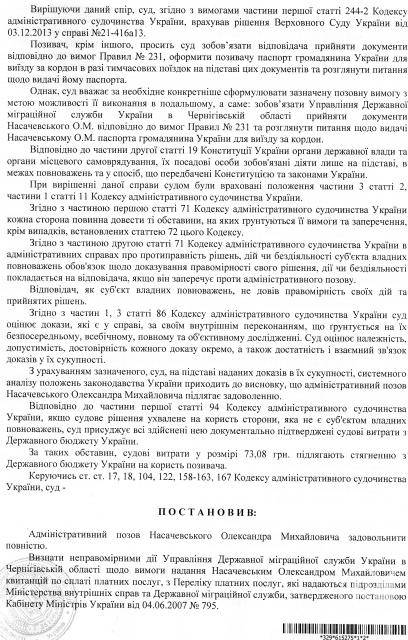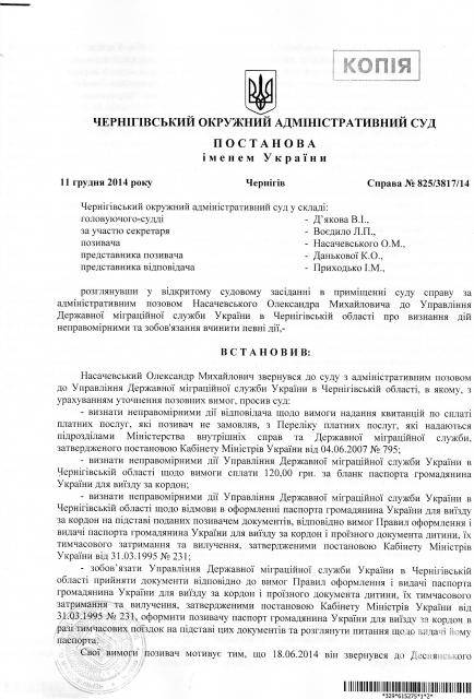 После чего активист решил доказать неправомерность действий управления ГМС Украины В Черниговской области в суде и обратился с соответствующим исковым заявлением в Черниговский окружной административный суд. В результате чего суд подтвердил стоимость заграничного паспорта в 170 грн.