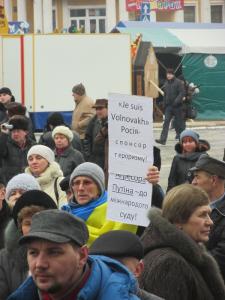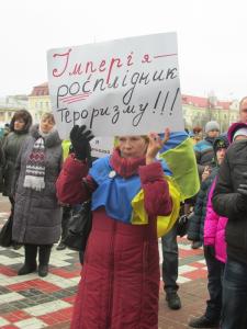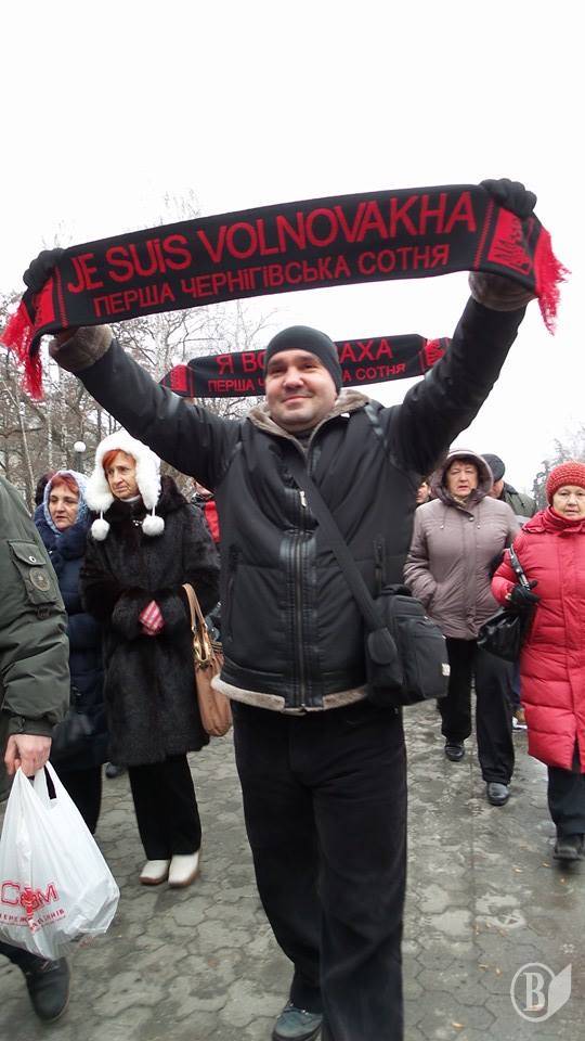 Черниговцы вышли с плакатами «Путин-убийца», «Я – Воловаха» на украинском и французском языках"Россия - спонсор терроризма","Агрессора Путина - в международный суд", Путин -спонсор терроризма!".
