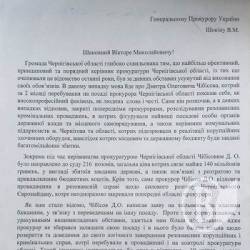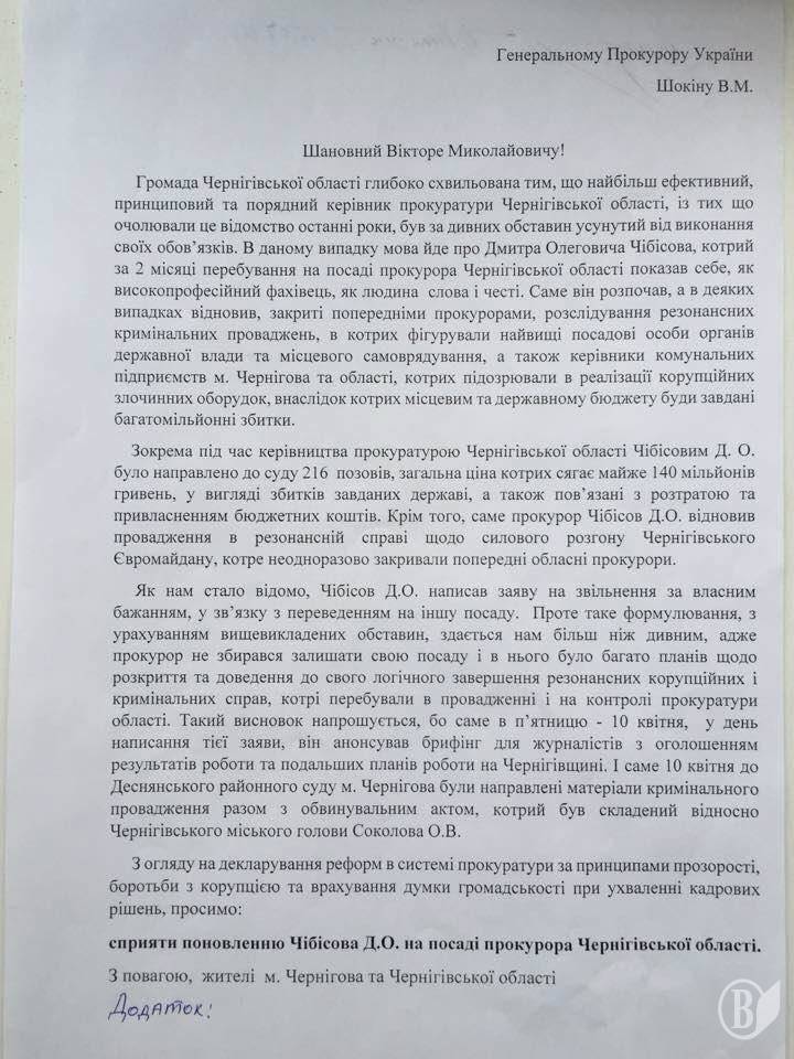 "Самопомич" призывает прийти и поставить свою подпись на открытом письме Генеральному Прокурору Украины Шокину В. М., чтобы он способствовал возобновлению Чибисова Д. О. на должности прокурора Черниговской области.